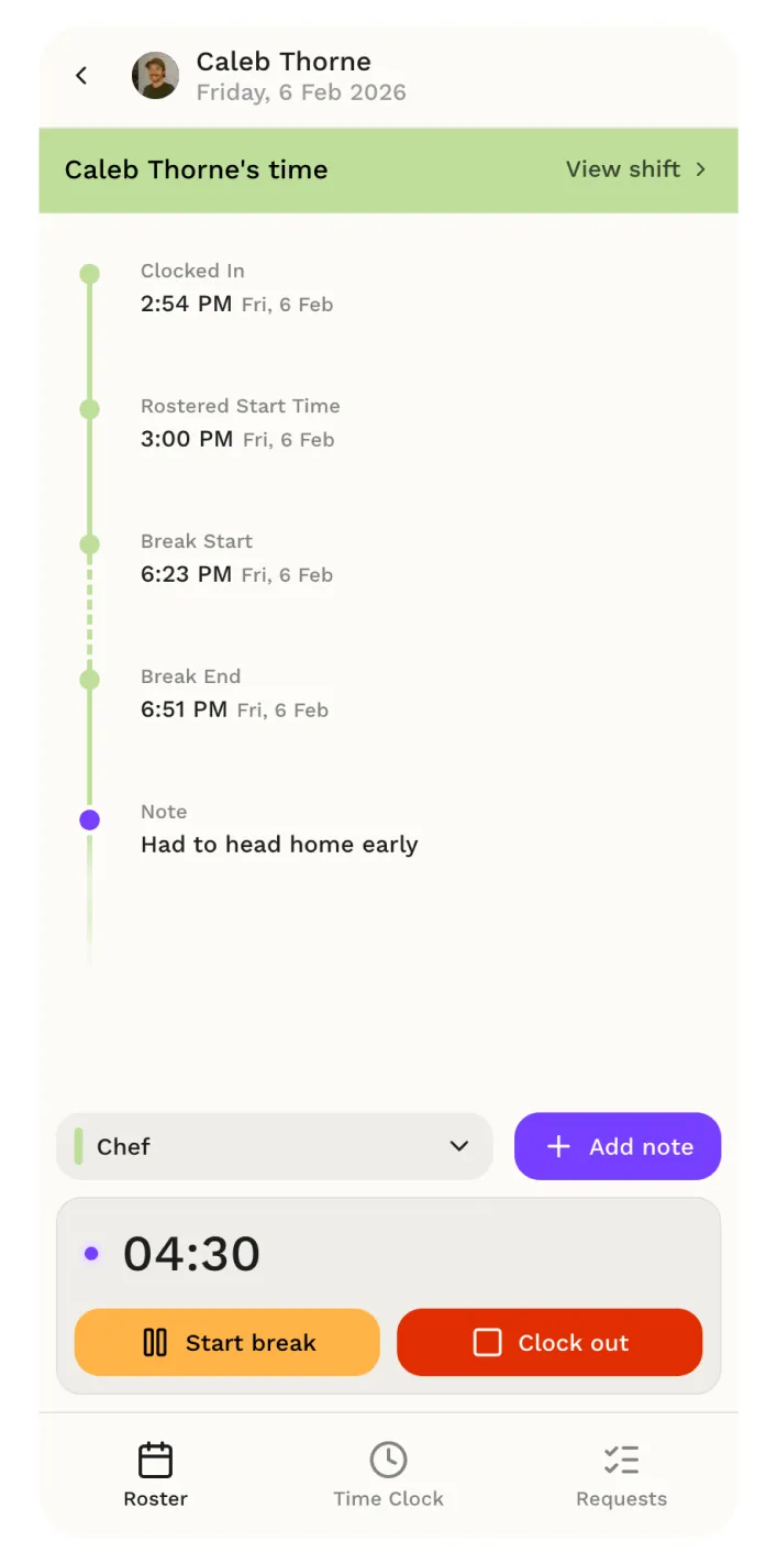 See rostered vs actual clock-ins, breaks and total hours worked, all tracked in one clear timeline.